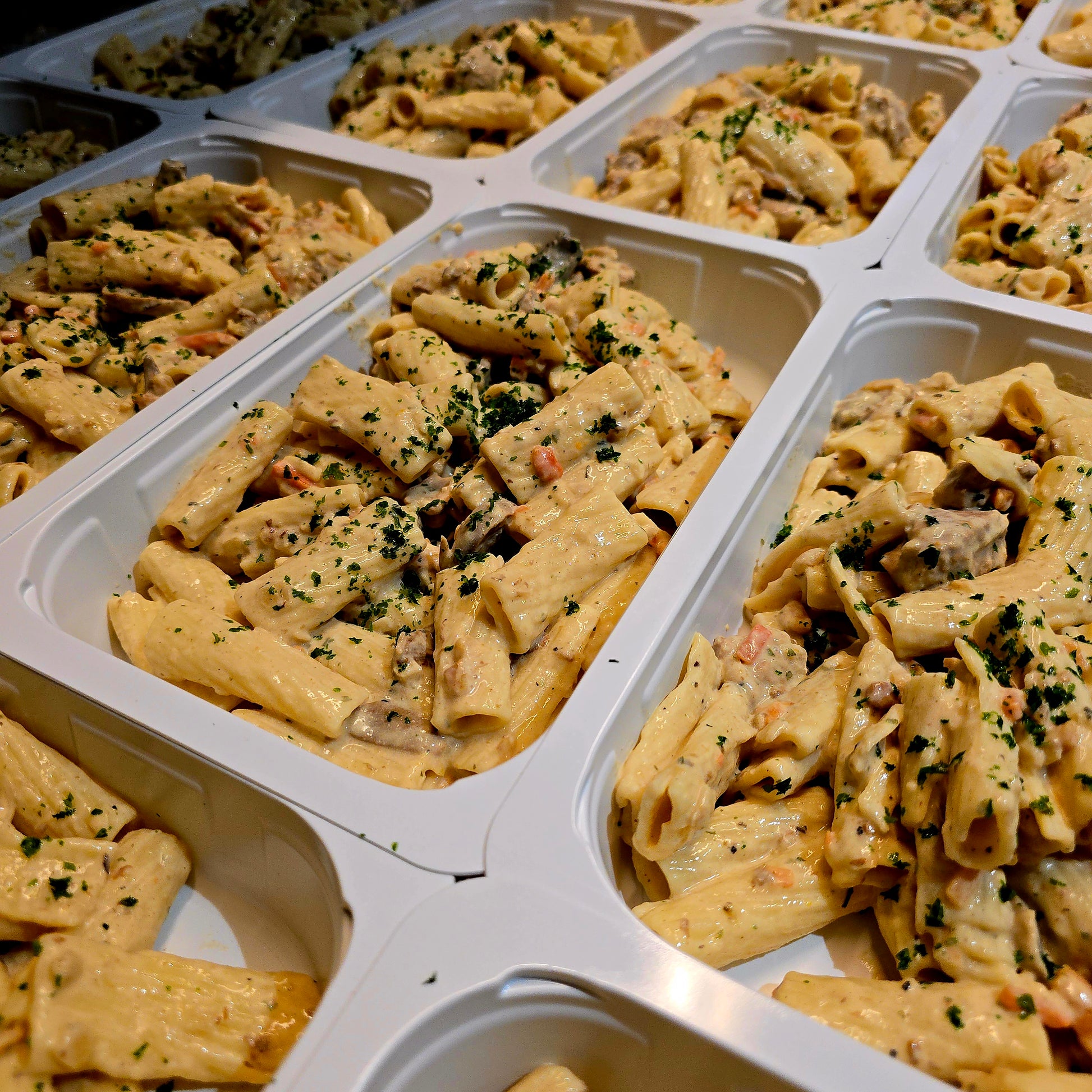 Fläskfilégryta (Fläskfilé, rotfrukter (morot, rotSELLERI, palsternacka), GRÄDDE (Pastöriserad GRÄDDE, stabiliseringsmedel (E407)) vatten, vitt vin (Vitt vin, salt, peppar, konserveringsmedel (SVAVELDIOXID E220, kaliumsorbat E202), antioxidant (c-vitamin)), Kantareller, champinjoner, lök, kalvfond (vatten, koncentrerad kalvfond, salt), salt, aromer, socker, modifierad stärkelse, lökpulver, tomatpulver, vinäger, stabiliseringsmedel (xantangummi)), vitlök, majsstärkelse, salt (NaCl, antiklumpmedel (E535), peppar, persilja) Pasta (DurumVETE. Kan innehålla spår av SOJA, SENAP,LUPIN)
