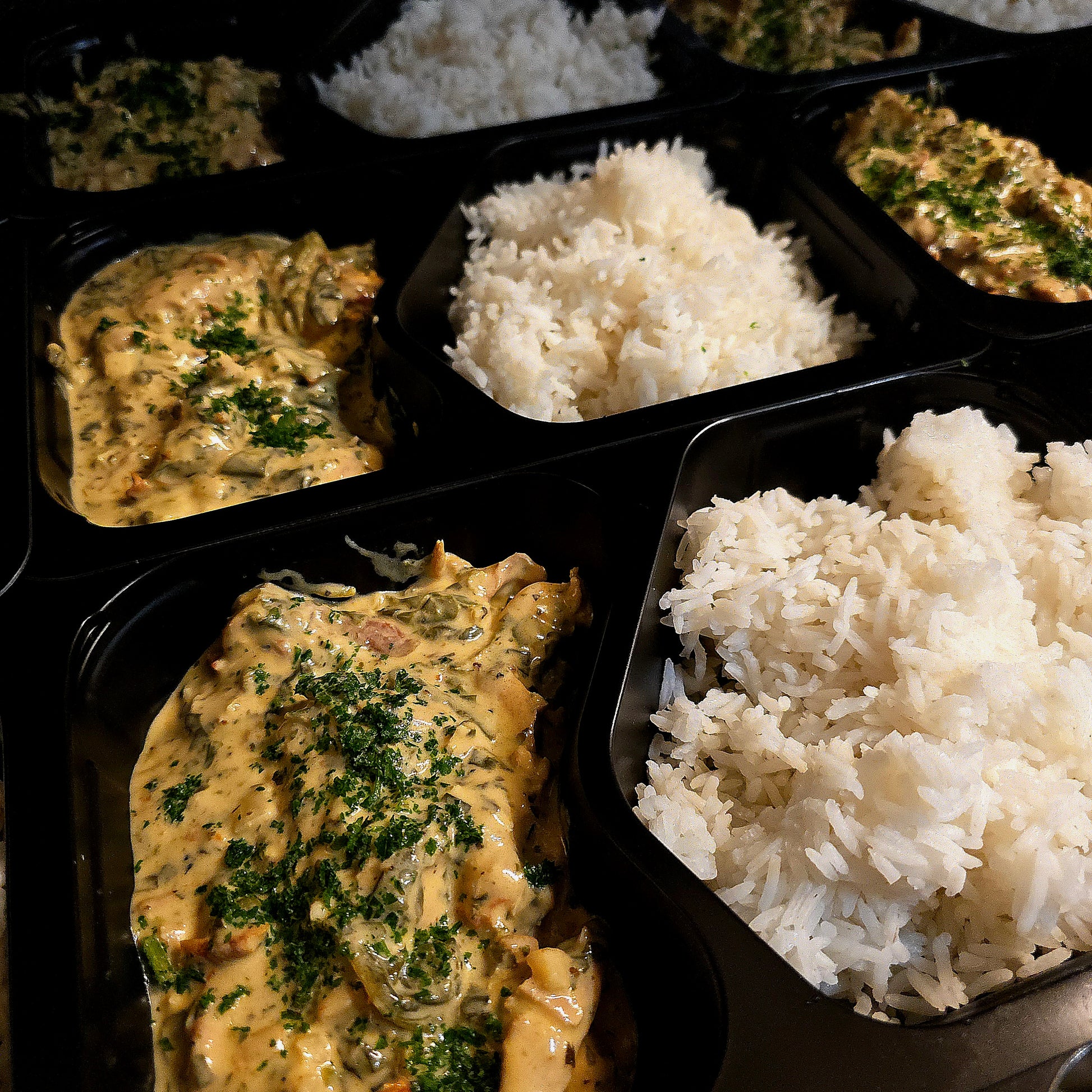 Gräddig gryta med soltorkad tomat, parmesan & basilika serveras ihop med ris