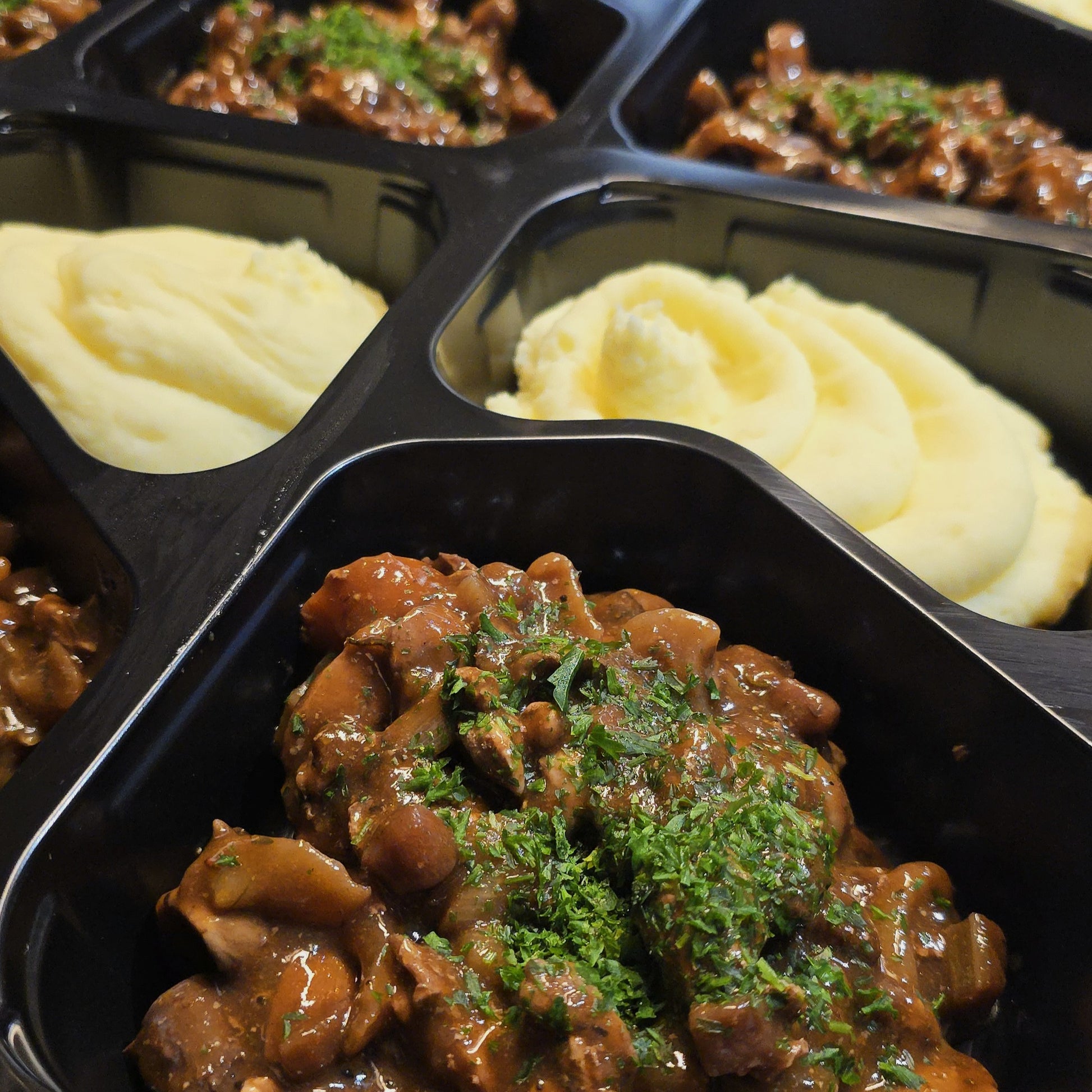 Smakrik gryta med saftig kyckling, rödvin, champinjoner & lök serveras ihop med potatismos